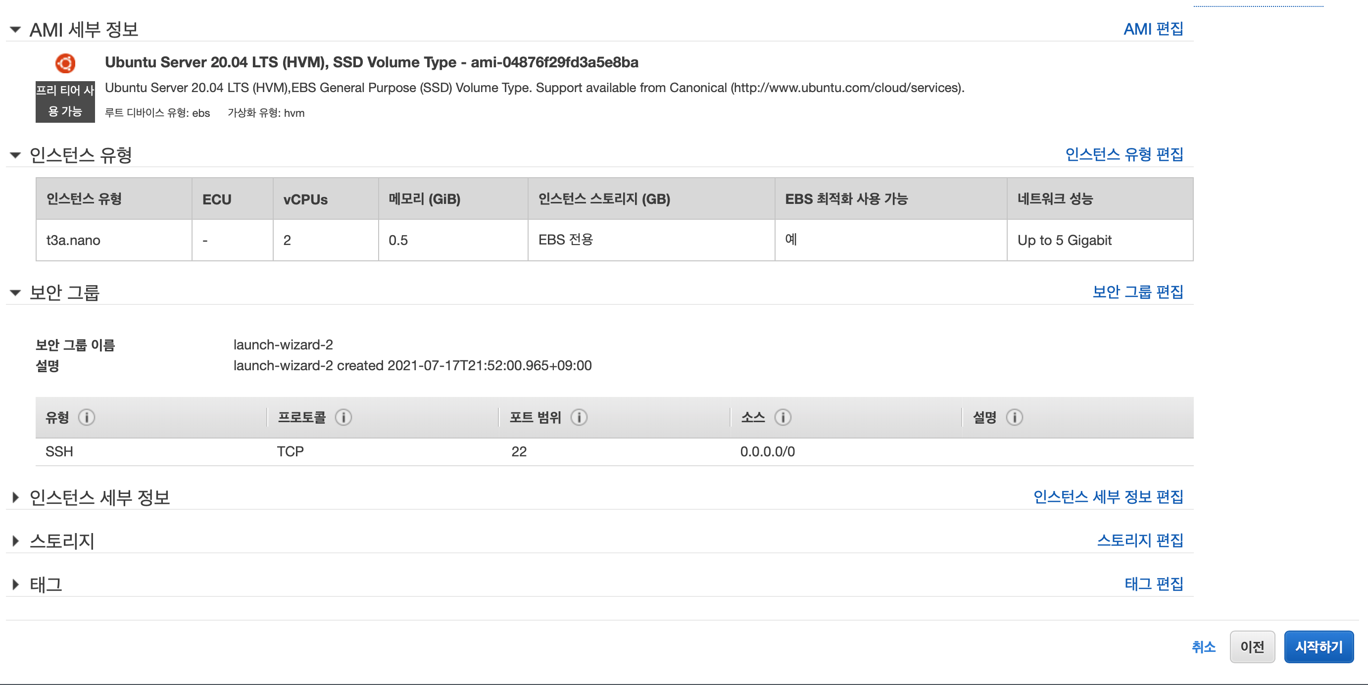 이 화면에서는 인스턴스 생성 직전에 최종적으로 검토하는 것이 가능합니다. 보안 그룹은 기본적으로 SSH 포트만 열려 있는 자동 생성된 보안 그룹이 적용됩니다. 추후 웹 서버 등을 운영할 경우 필요한 포트를 추가적으로 열어야 합니다. 스토리지는 기본적으로 8GB로 설정되어 있으며 필요하다면 변경 가능합니다. 검토를 마쳤다면 우측 하단의 [시작하기] 버튼을 누릅니다.