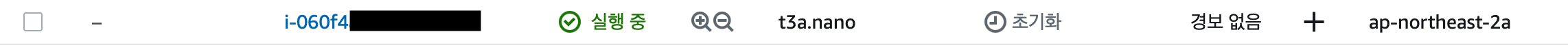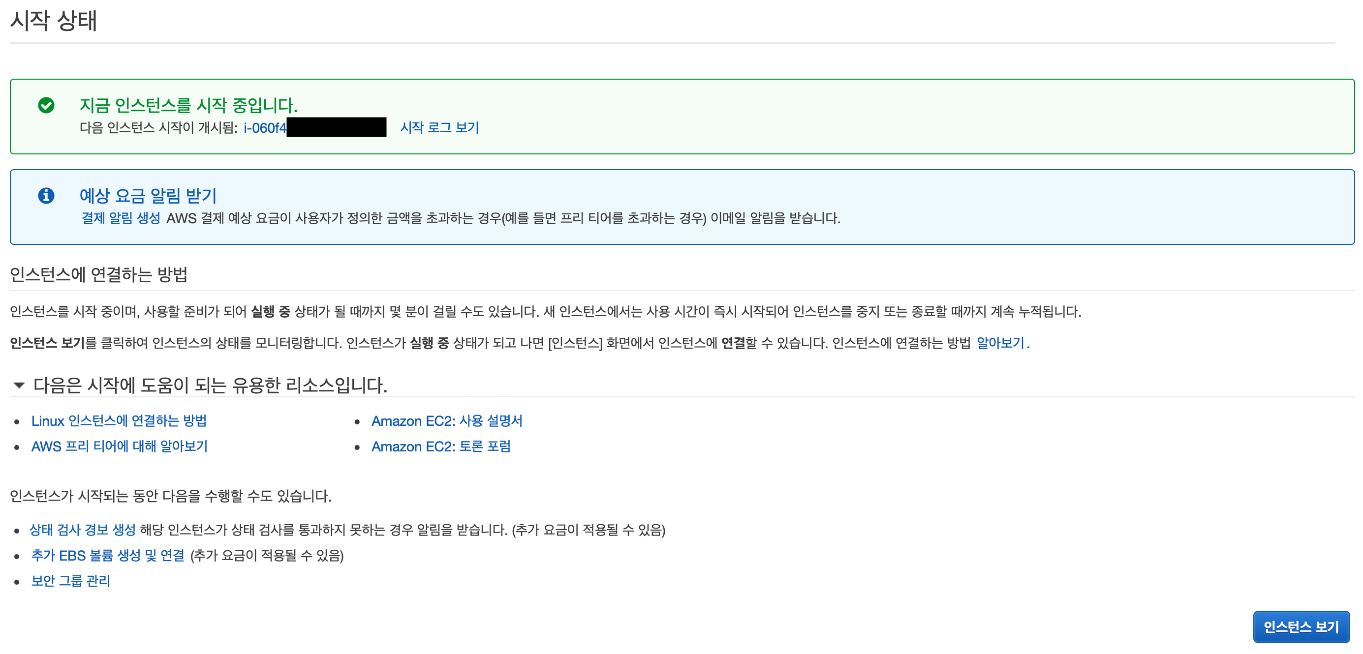 위와 같이 인스턴스를 시작 중이라는 메시지가 표시됩니다. 우측 하단의 [인스턴스 보기]를 누르면 대시보드에서 초기화 중인 인스턴스를 확인할 수 있습니다. 이 초기화 과정은 일반적으로 몇 분이 소요되며 브라우저의 새로고침을 통해 초기화가 완료되었는지 확인하면 됩니다.