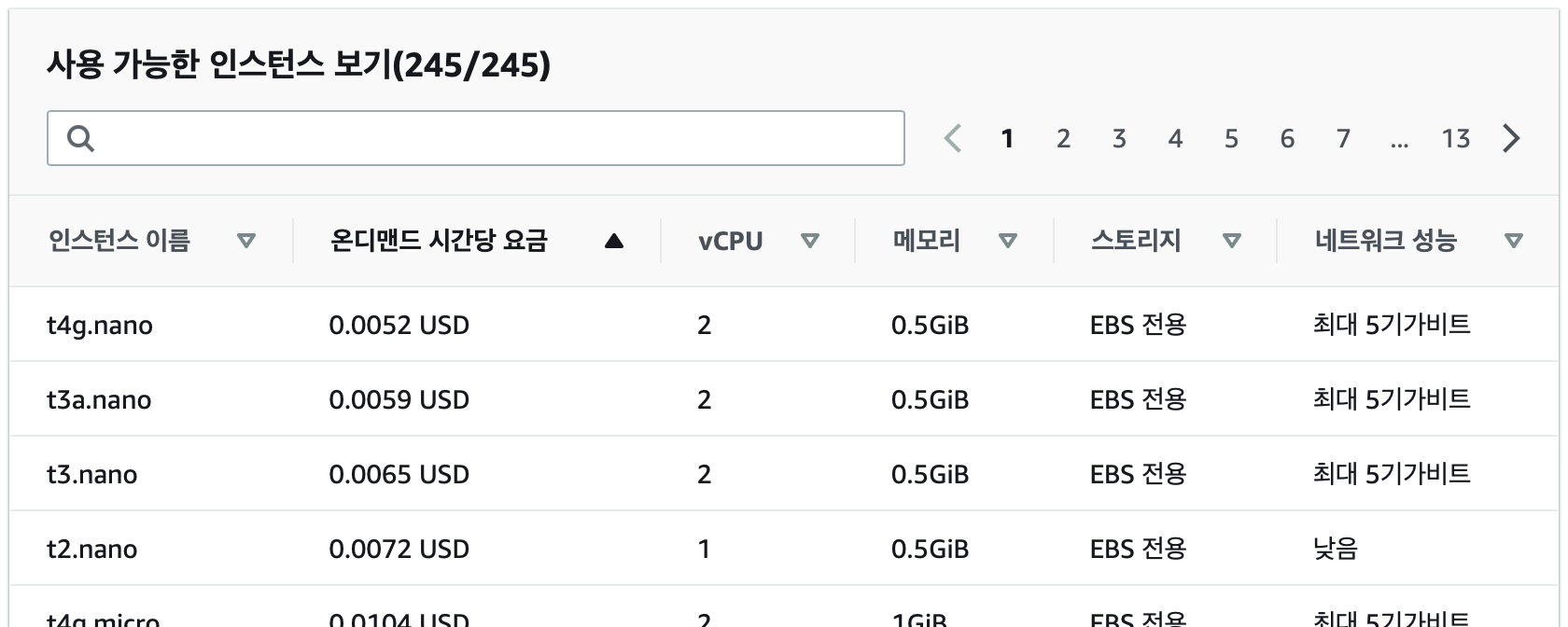 저는 프리 티어 사용자가 아니어서 Ubuntu를 사용할 수 있는 인스턴스 중 가격이 가장 저렴한 인스턴스인 [t3a.nano]를 선택했습니다. (아래는 시간당 요금이 가장 저렴한 순서로 정렬한 표입니다.)