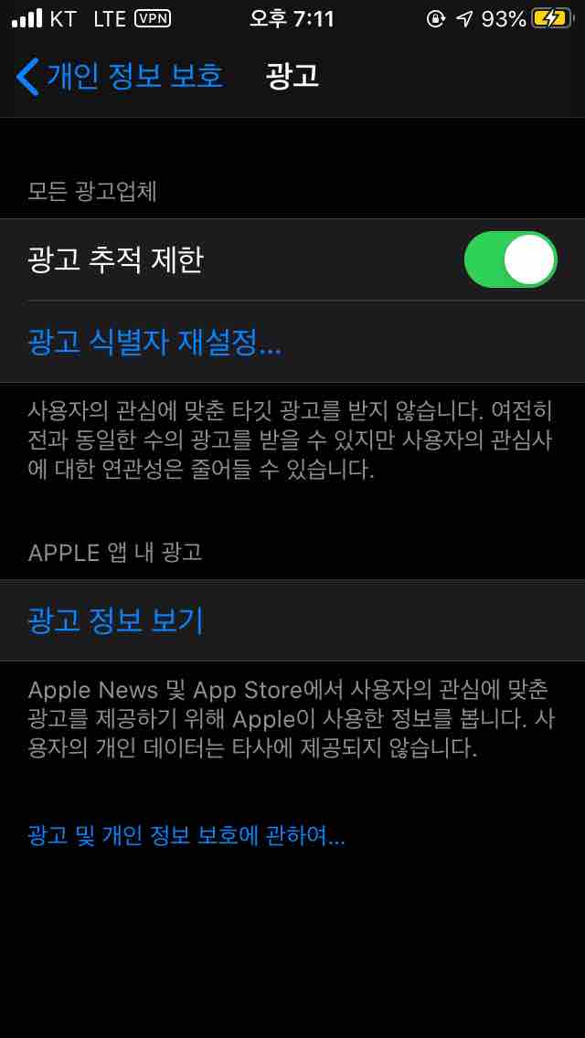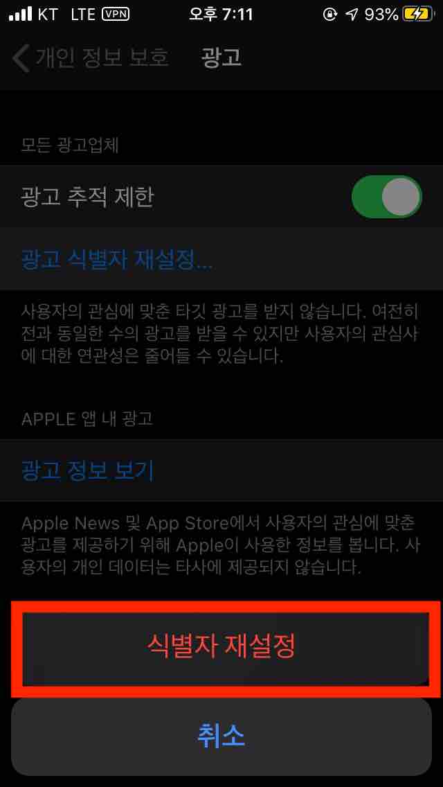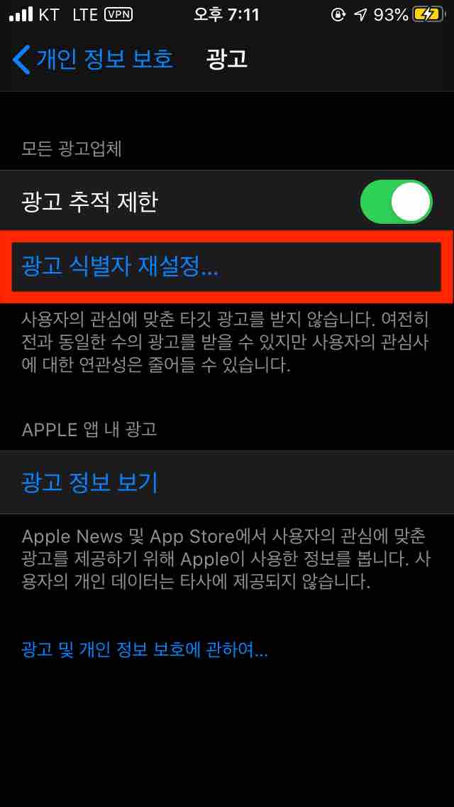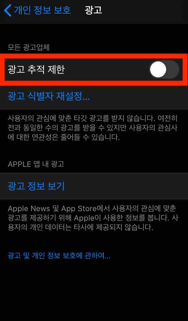 이제 [광고 추적 제한] 활성화와 [광고 식별자]를 재설정하는 방법을 알아보겠습니다.