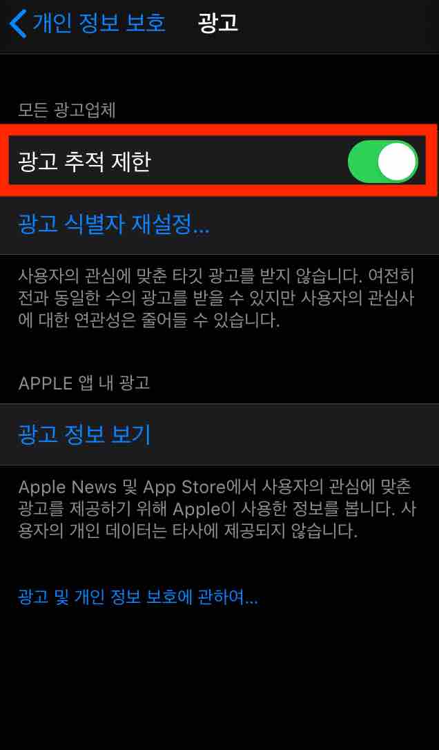 3. [광고 추적 제한]을 활성화(스위치 켜기)하면 사용자의 취향에 맞춤화된 광고가 표시되지 않습니다.