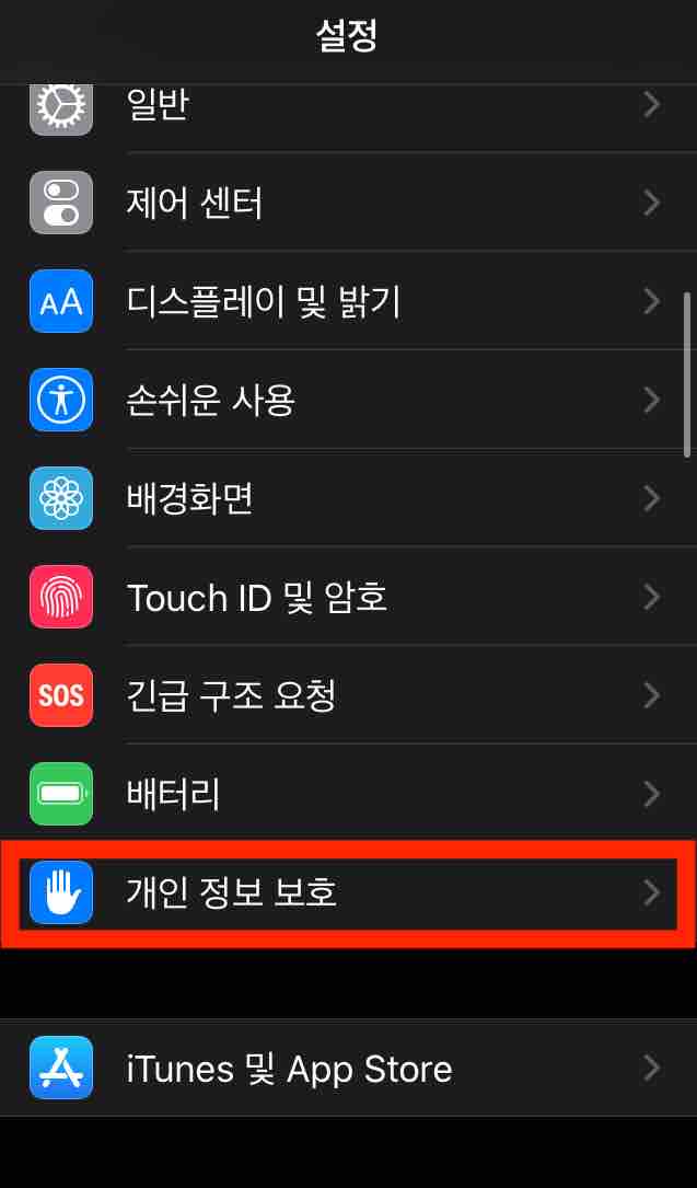 1. [설정]에서 [개인 정보 보호] 메뉴를 선택합니다.