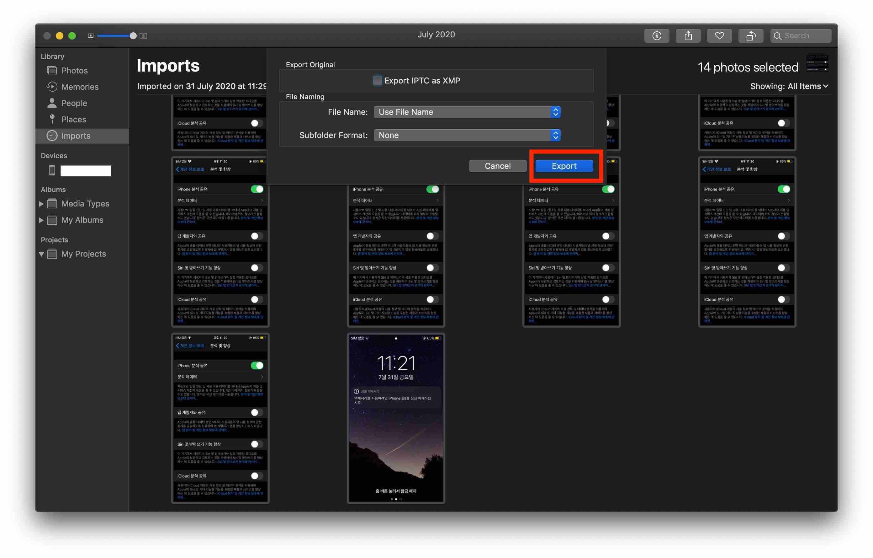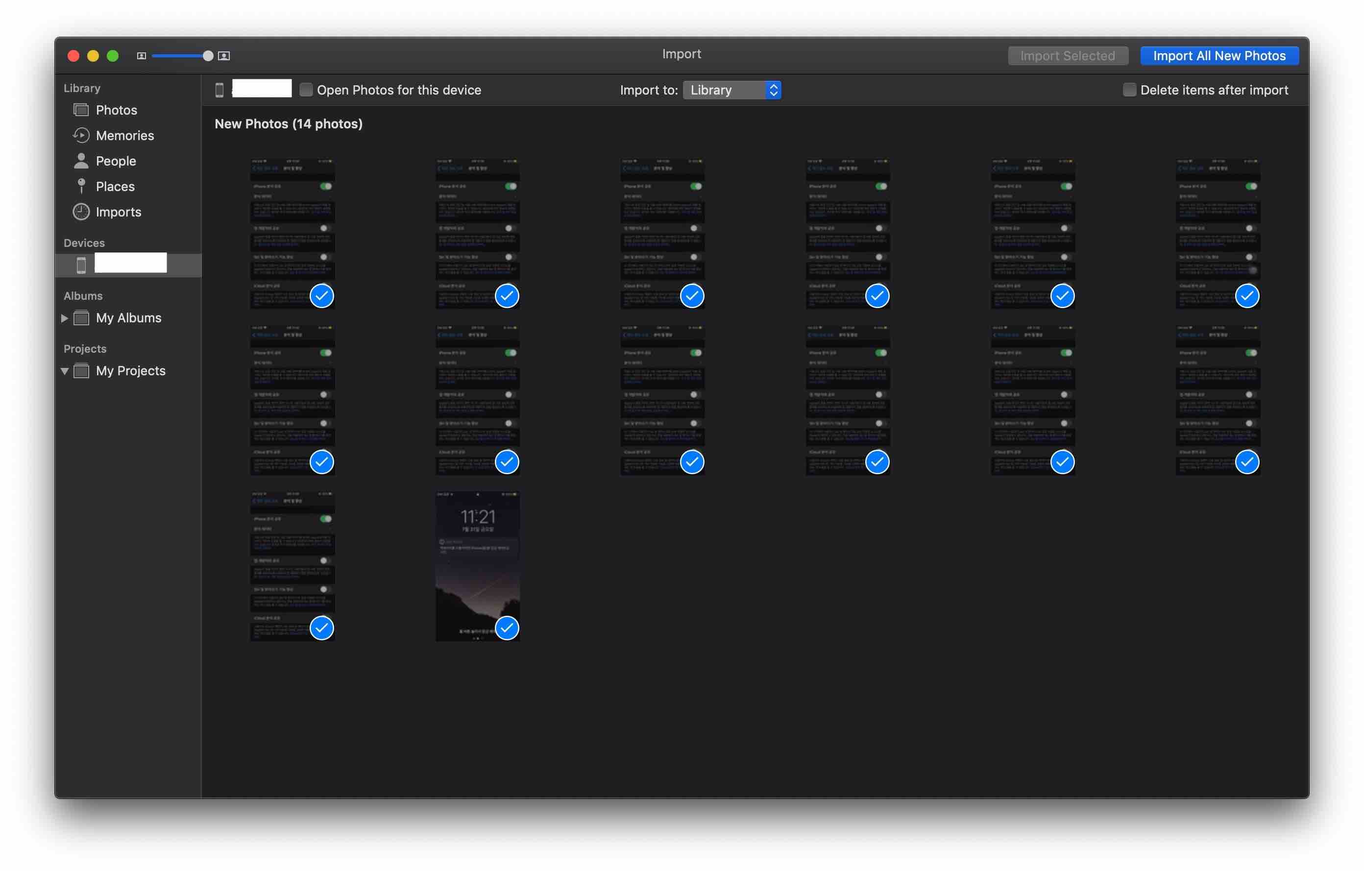 8. 사진 앱의 우측 상단의 [선택 항목 가져오기(Import Selected)] 또는 [새로운 모든 사진 가져오기(Import All New Photos)] 버튼을 선택합니다.