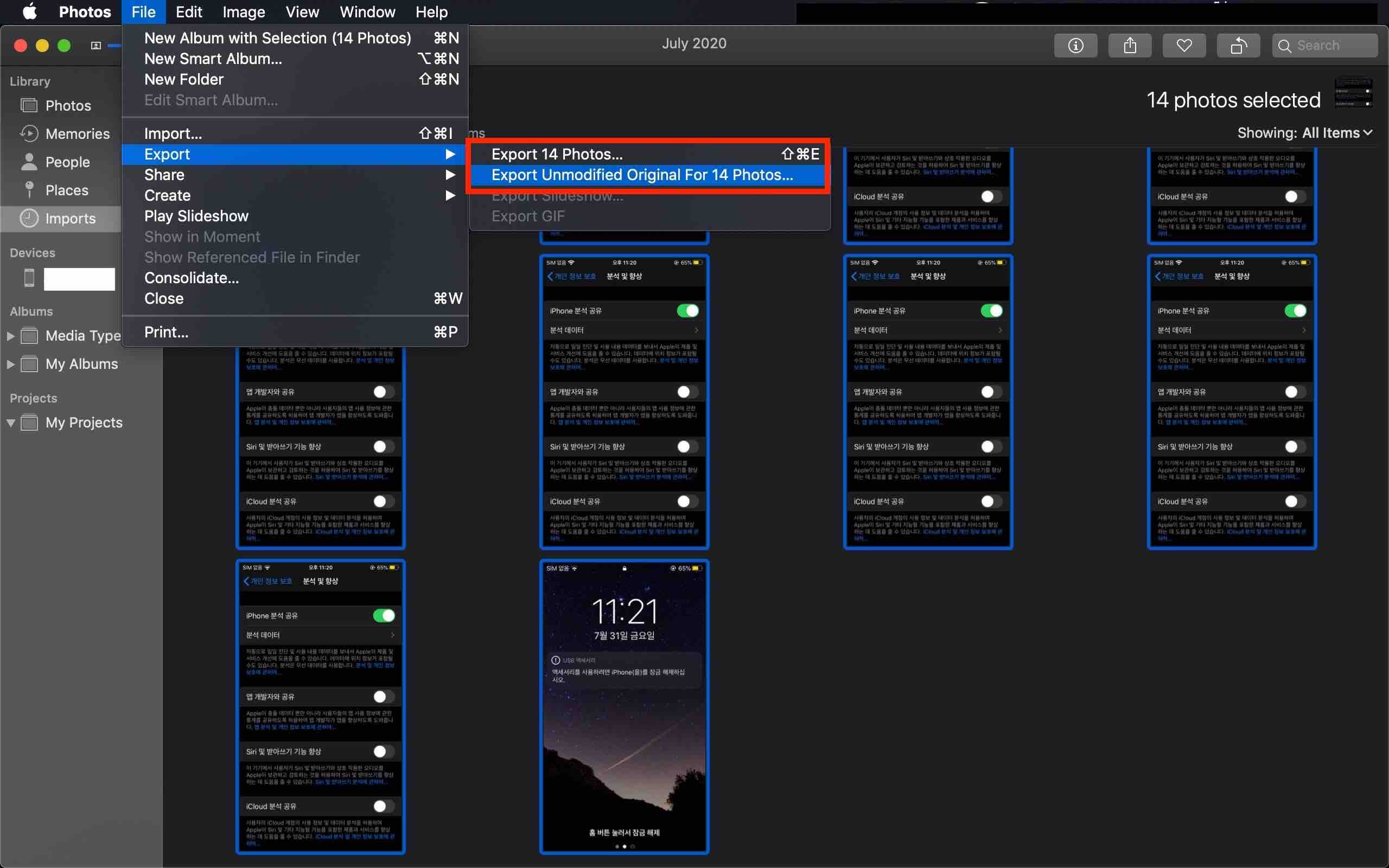 10. 상단 메뉴의 [파일(File)]-[추출하기(Export)]-[n개의 사진 추출하기(Export n Photos...)] 또는 [수정하지 않은 원본으로 n개의 사진 추출하기(Export Unmodified Original For n Photos...)]를 선택합니다.