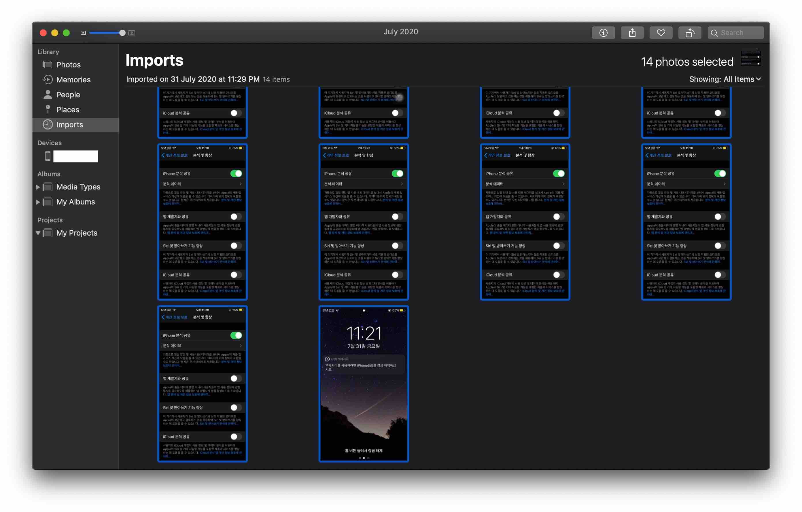 8. 아이폰의 사진을 [가져온 항목(Imports)] 메뉴로 가져왔습니다.