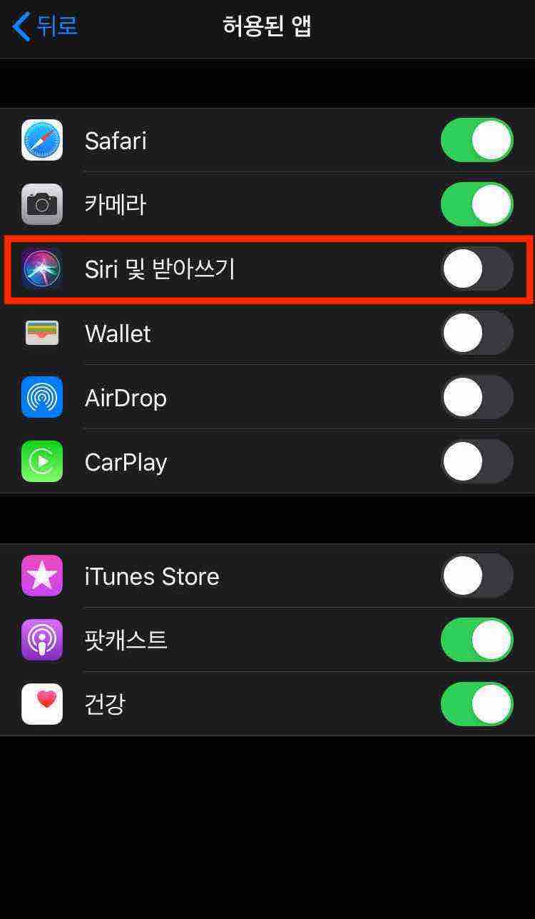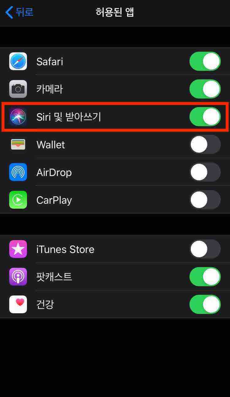 이 화면에서 자신의 취향에 맞게 스위치를 ON/OFF 하여 Siri 기능의 사용 범위를 설정하면 됩니다.