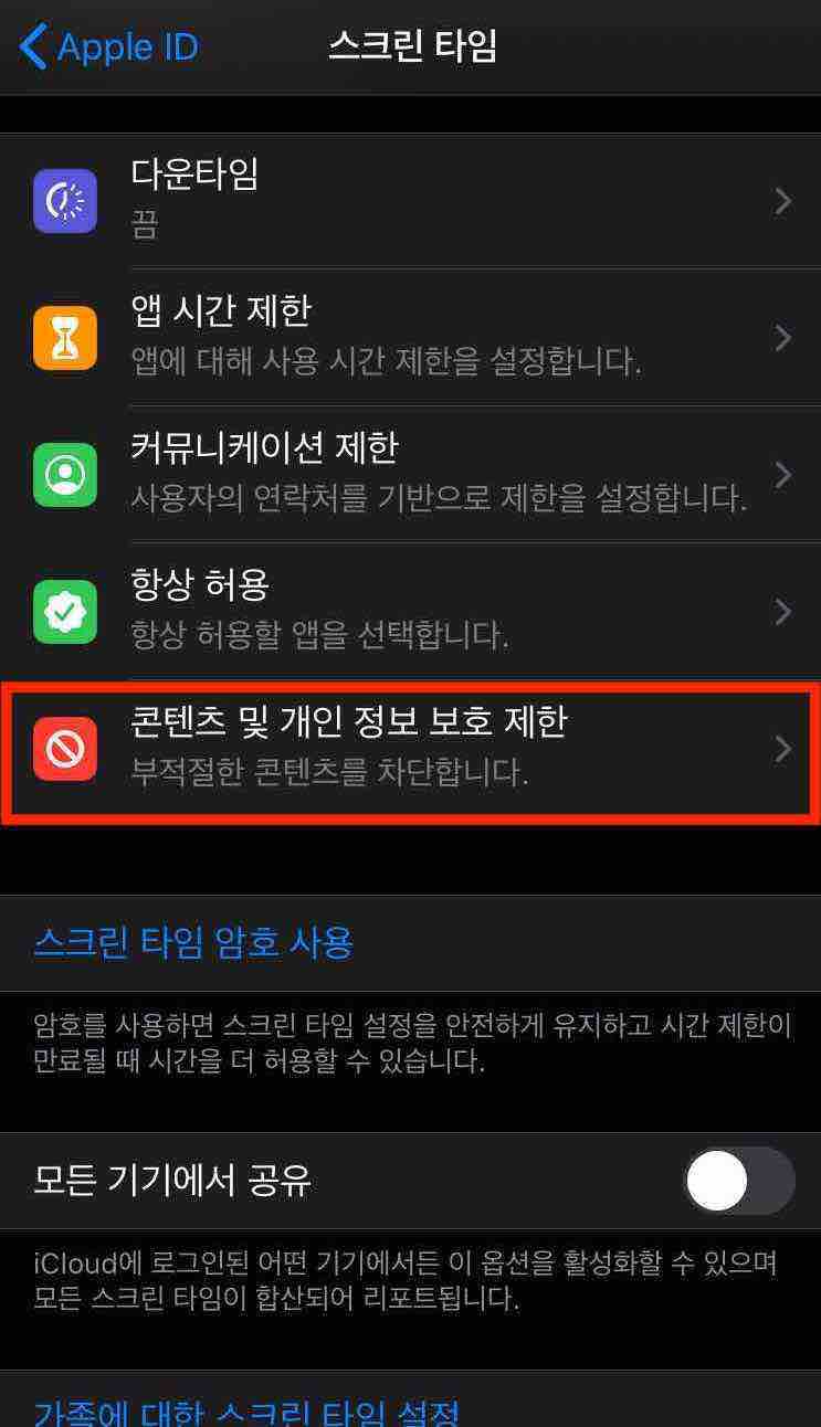 6. [스크린 타임] 메뉴에서 스크롤을 아래로 내려서 [콘텐츠 및 개인 정보 보호 제한] 메뉴를 선택합니다.