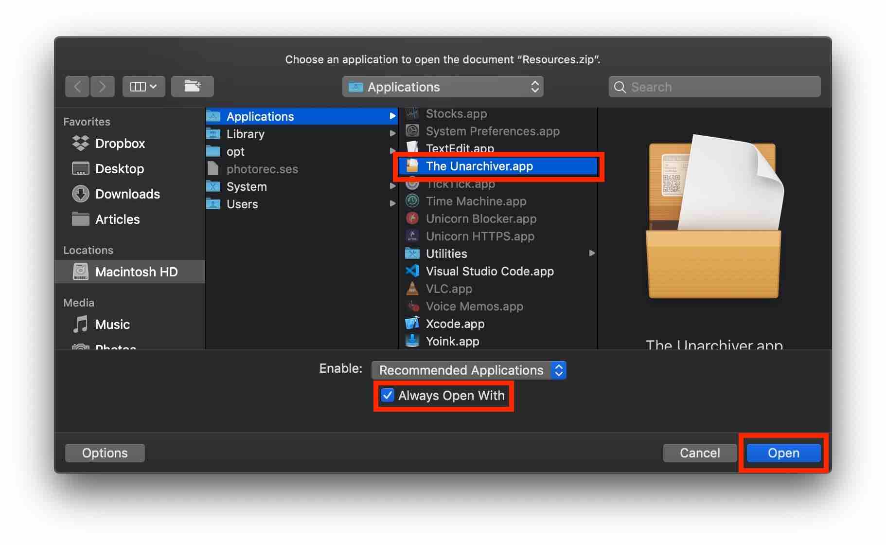 8. [응용 프로그램(Application)] 폴더에서 'The Unarchiver.app'을 선택하고 [항상 이 프로그램으로 열기(Always Open With)]를 체크합니다. 그리고 [Open] 버튼을 선택합니다.