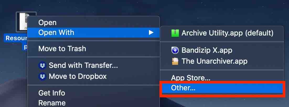 7. 압축을 해제하고자 하는 파일을 오른쪽 클릭하고 [다음으로 열기(Open With)]-[기타(Other)]를 선택합니다.