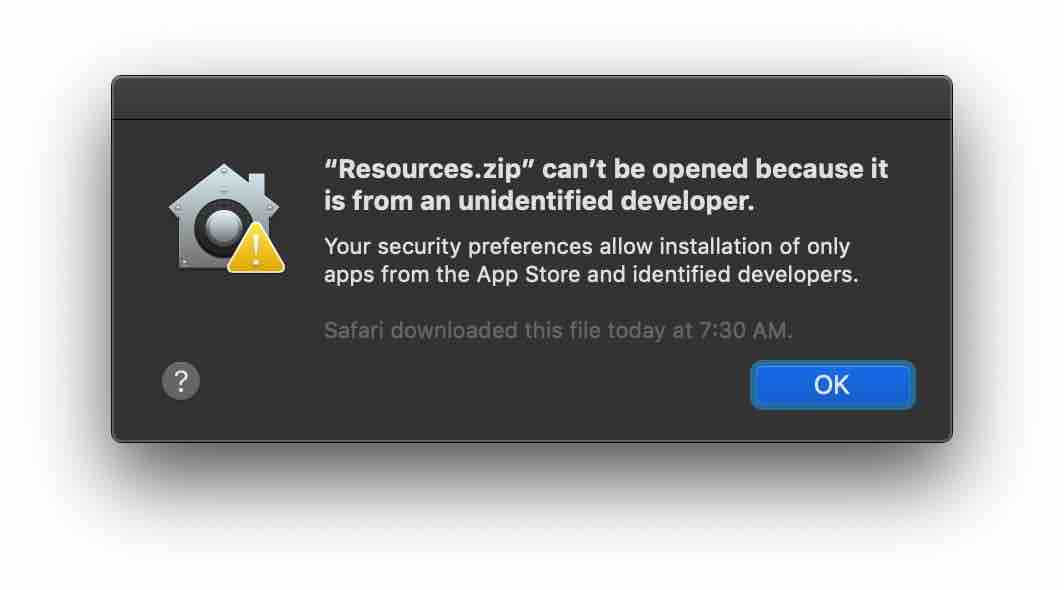 'ㅁㅁㅁ is from an unidentified developer. Are you sure you want to open it?'