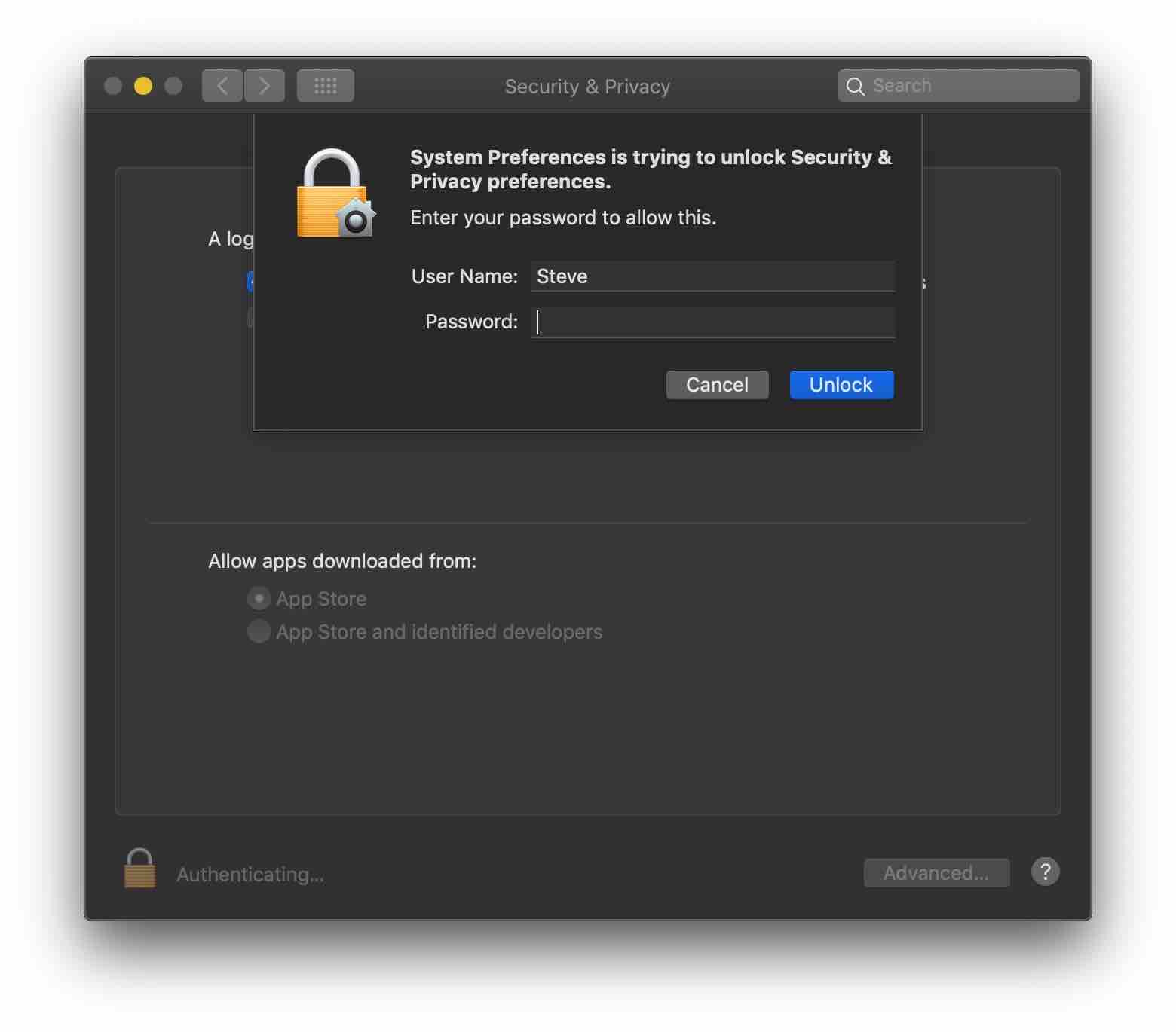 2. 맥 암호를 입력하고 [잠금 해제(Unlock)]를 선택합니다.