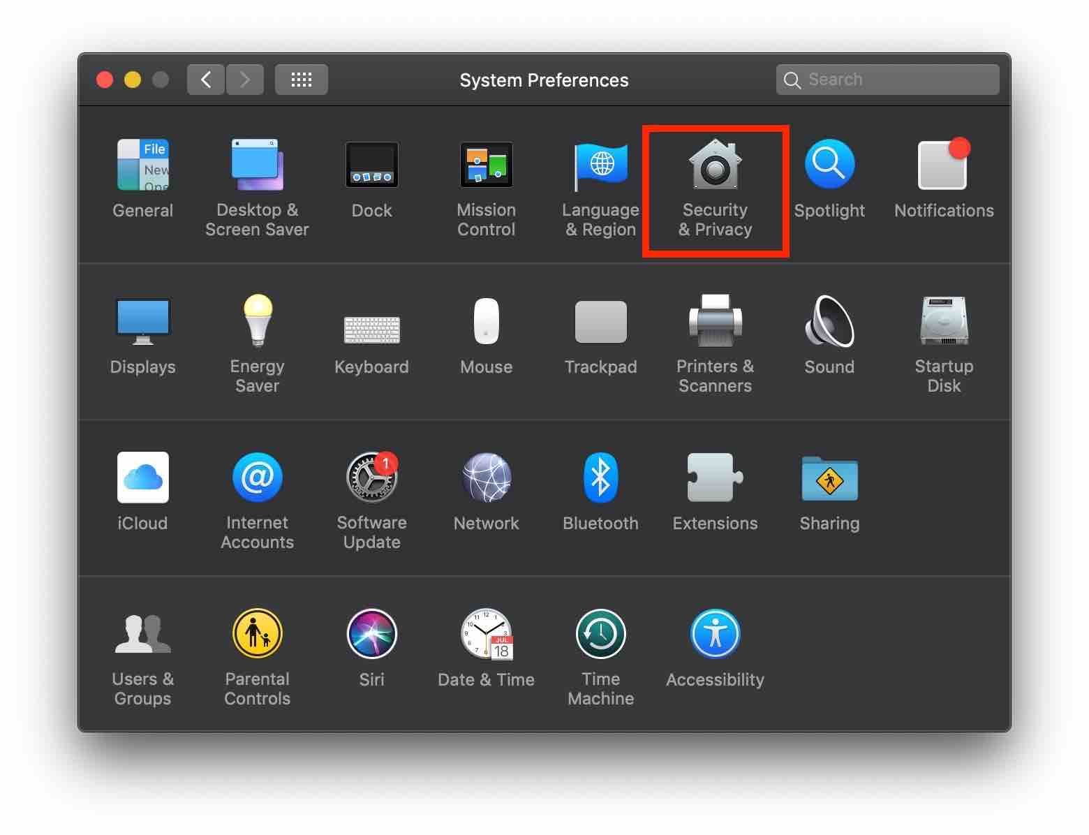 2. 이 경우 [시스템 환경설정(System Preferences)]에서 [보안 및 개인 정보 보호(Security & Privacy)]를 선택합니다.
