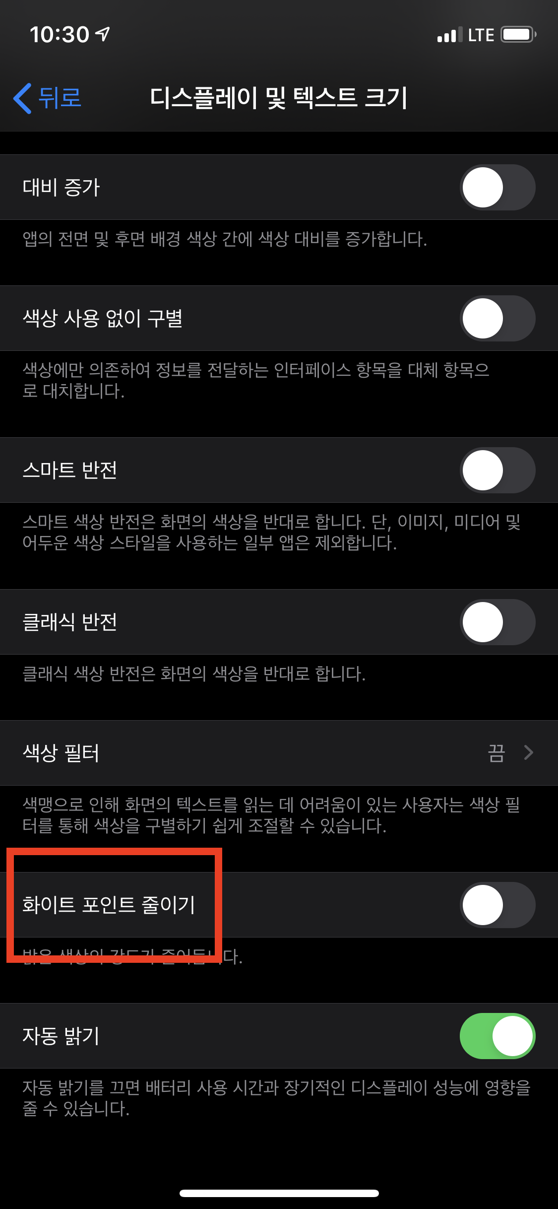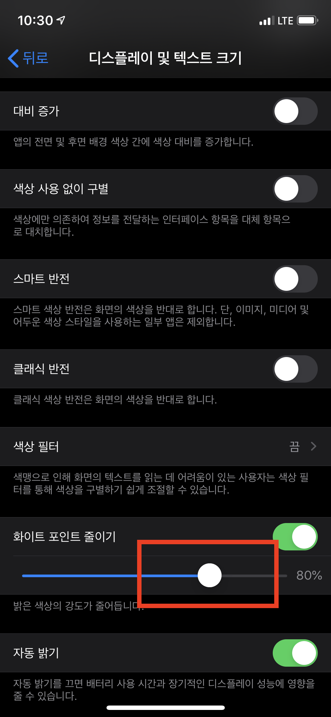 [화이트 포인트 줄이기]를 활성화하면 밝기를 조절할 수 있는 슬라이더 바가 나타나는데, 이를 조절해서 원하는 밝기를 설정합니다.