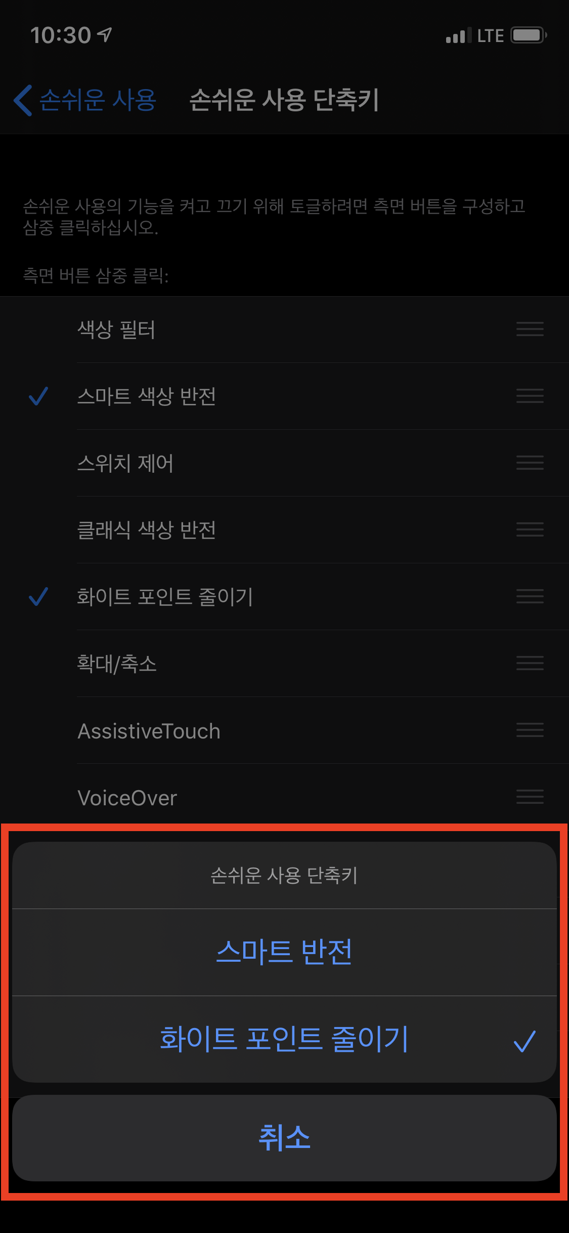 등록이 됐는지 확인해 보기 위해서 홈 버튼(아이폰 X, Xr, Xs, 11, 11 프로 모델의 경우 전원 버튼)을 세 번 연속으로 빠르게 누릅니다. 만약 [화이트 포인트 줄이기] 항목 하나만 단축키로 등록되어 있다면, 버튼을 세 번 누를 때마다 위에서 설정했던 강도로 밝기 설정이 활성화/비활성화될 것입니다. [화이트 포인트 줄이기] 항목뿐만 아니라 다른 항목들도 같이 단축키로 등록되어 있다면, 버튼을 세 번 눌렀을 때 아래처럼 어떤 항목을 활성화/비활성화할 것인지에 대한 다이얼로그가 표시됩니다. 이 중 [화이트 포인트 줄이기]를 선택하면 밝기 설정이 활성화/비활성화됩니다.
