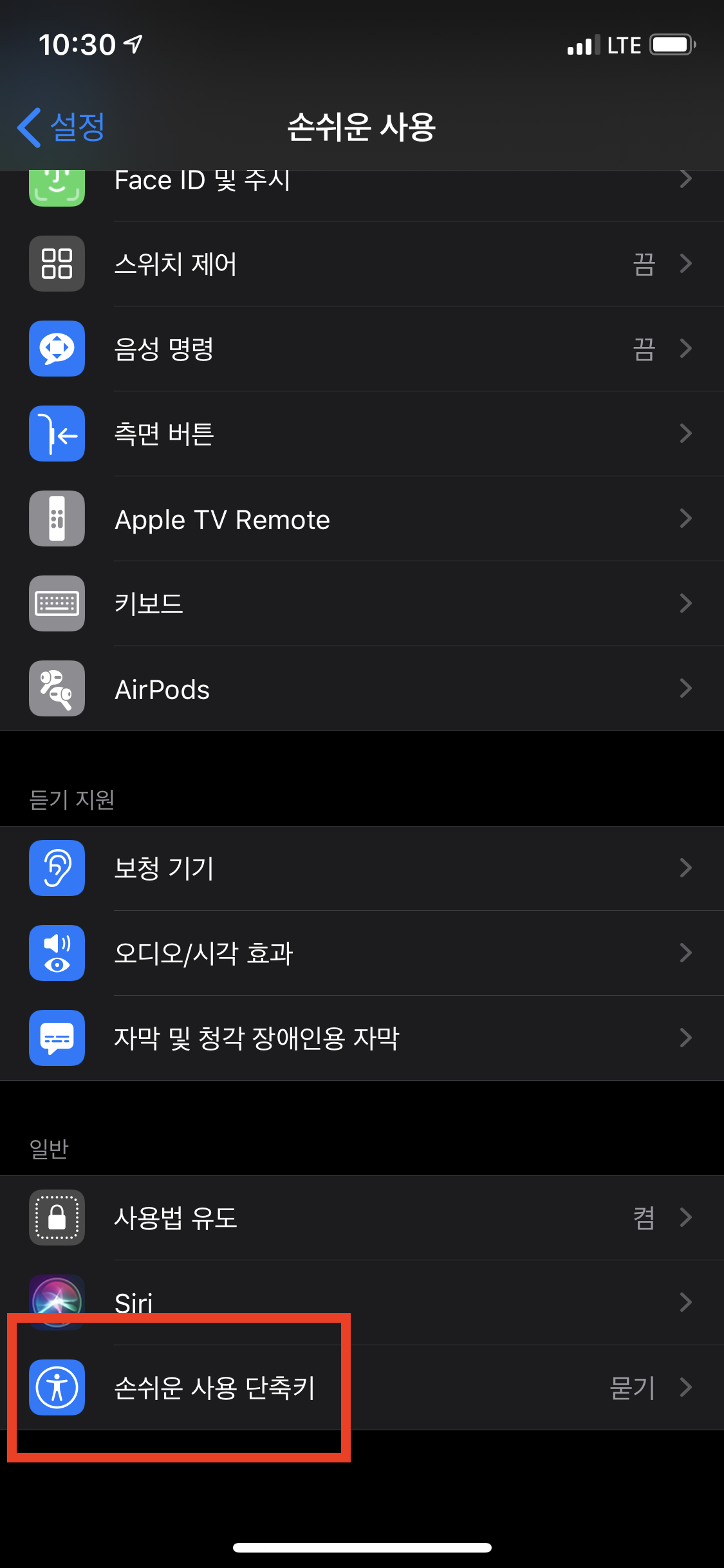 [손쉬운 사용] 설정 화면에서 스크롤을 내려보면 아래와 같이 [손쉬운 사용 단축키]라는 항목이 있습니다. 이것을 눌러서 단축키 설정 화면으로 들어갑니다.
