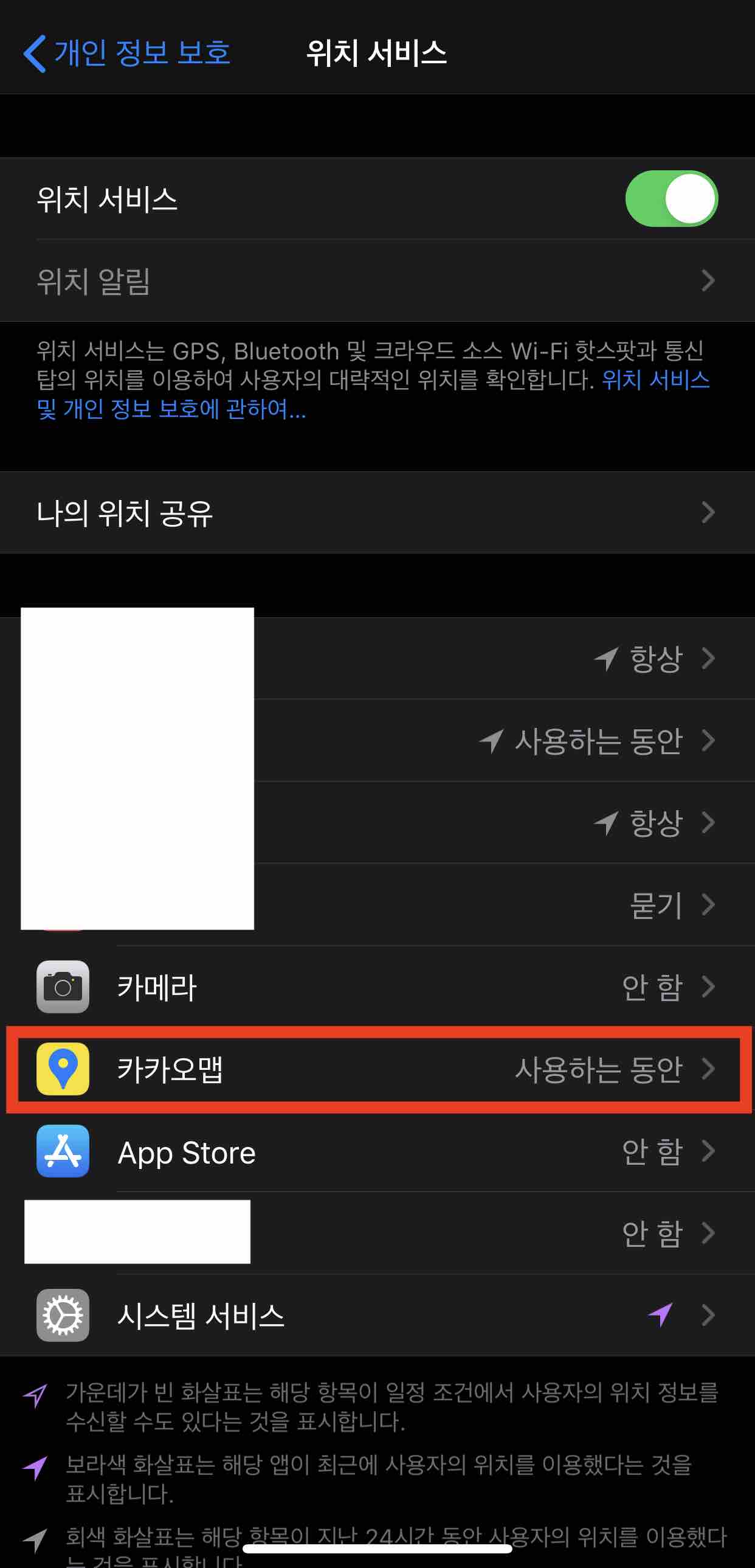 [카메라]와 [App Store] 앱의 경우 위치 정보에 접근할 수 없습니다.