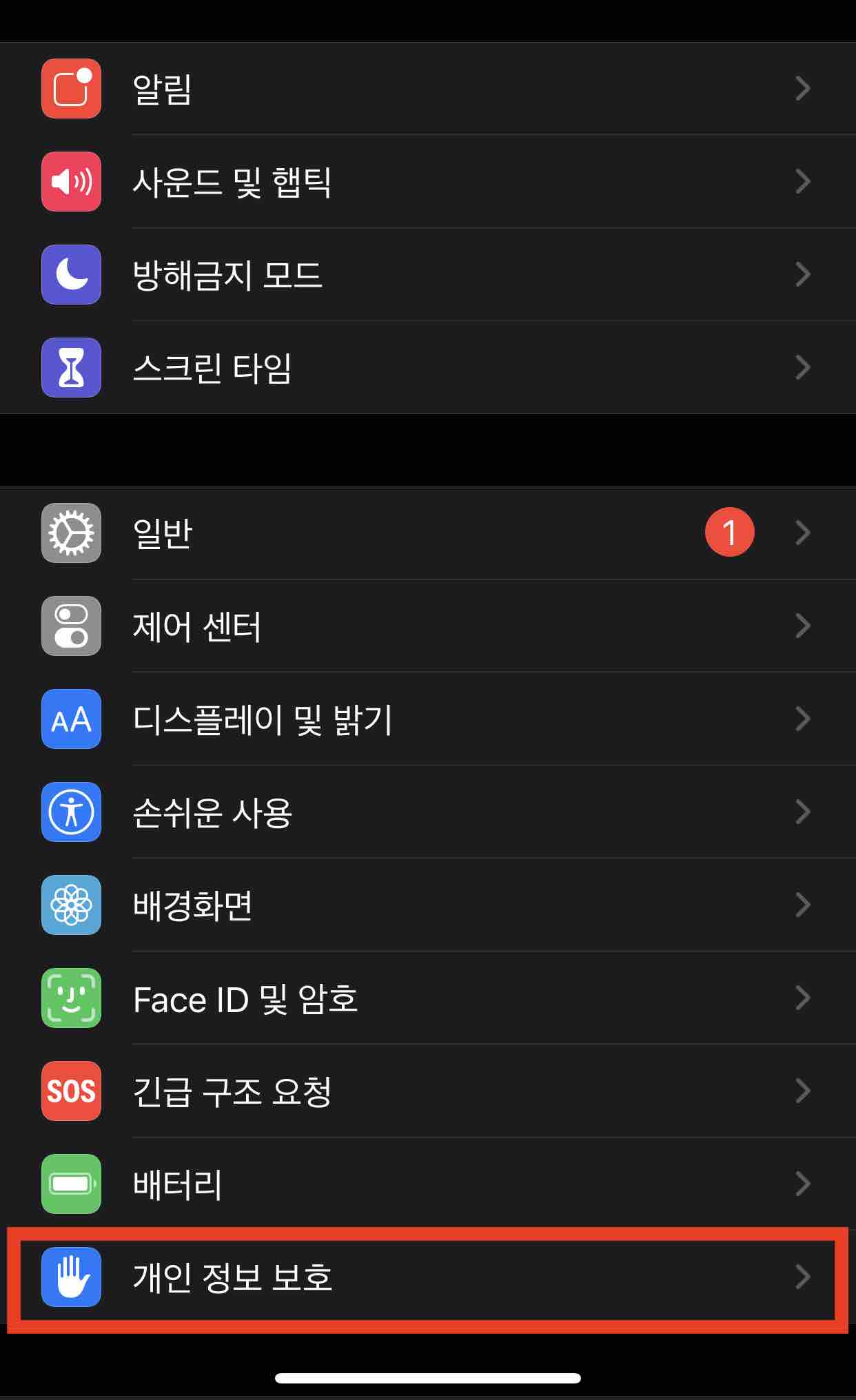 1. [설정] 메뉴에서 스크롤을 내려 [개인 정보 보호] 메뉴를 선택합니다.