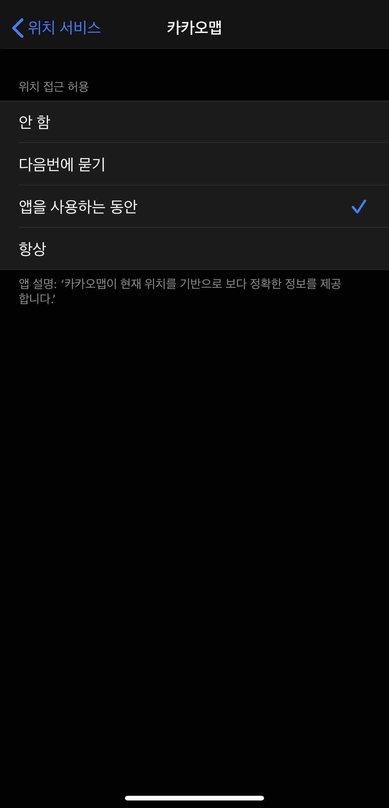 현재 '카카오맵' 앱은 이 앱을 사용하는 동안에만 해당 앱이 내 아이폰의 위치 정보에 접근할 수 있도록 권한이 설정되어 있습니다.