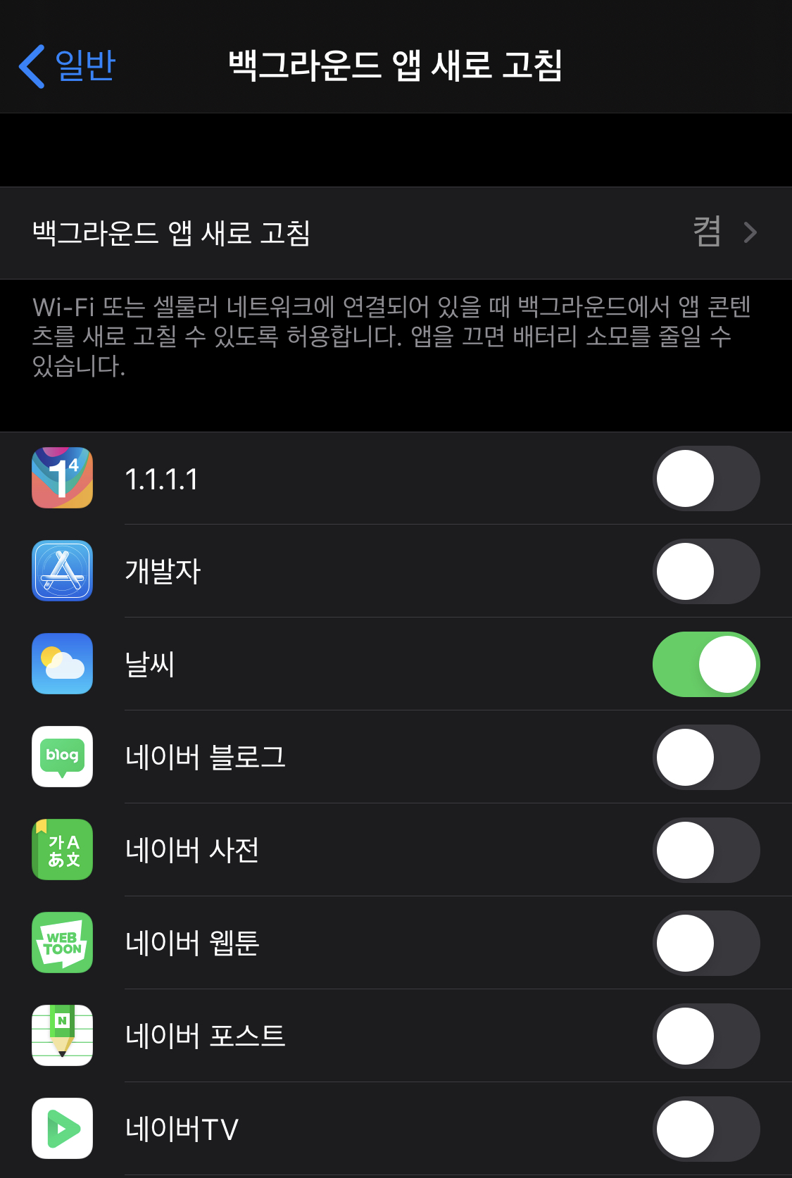 '백그라운드 앱 새로 고침'은 대부분의 경우, 앱을 실행했을 때 업데이트된 콘텐츠를 1초라도 빨리 보여 주기 위해서 사용됩니다. 이것이 필요 없다면 (특히 우리나라처럼 인터넷이 빠른 환경에서는) '백그라운드 앱 새로 고침'은 꼭 필요하다고 생각되는 앱을 제외하고는 꺼놓는 것을 추천드립니다. 백그라운드에서 작업을 수행할 때마다 약간의 전력과 와이파이 혹은 셀룰러 데이터를 사용하므로, 다수의 앱에 대하여 '백그라운드 앱 새로 고침'이 활성화되어 있다면 아이폰을 사용하지 않을 때도 불필요하게 배터리가 소모되기 때문입니다.***