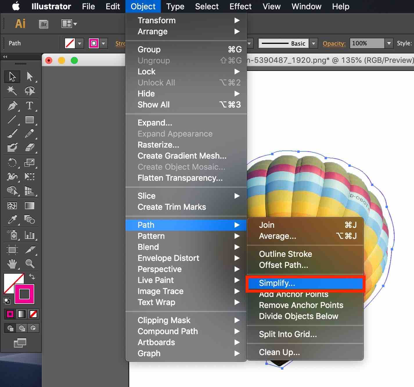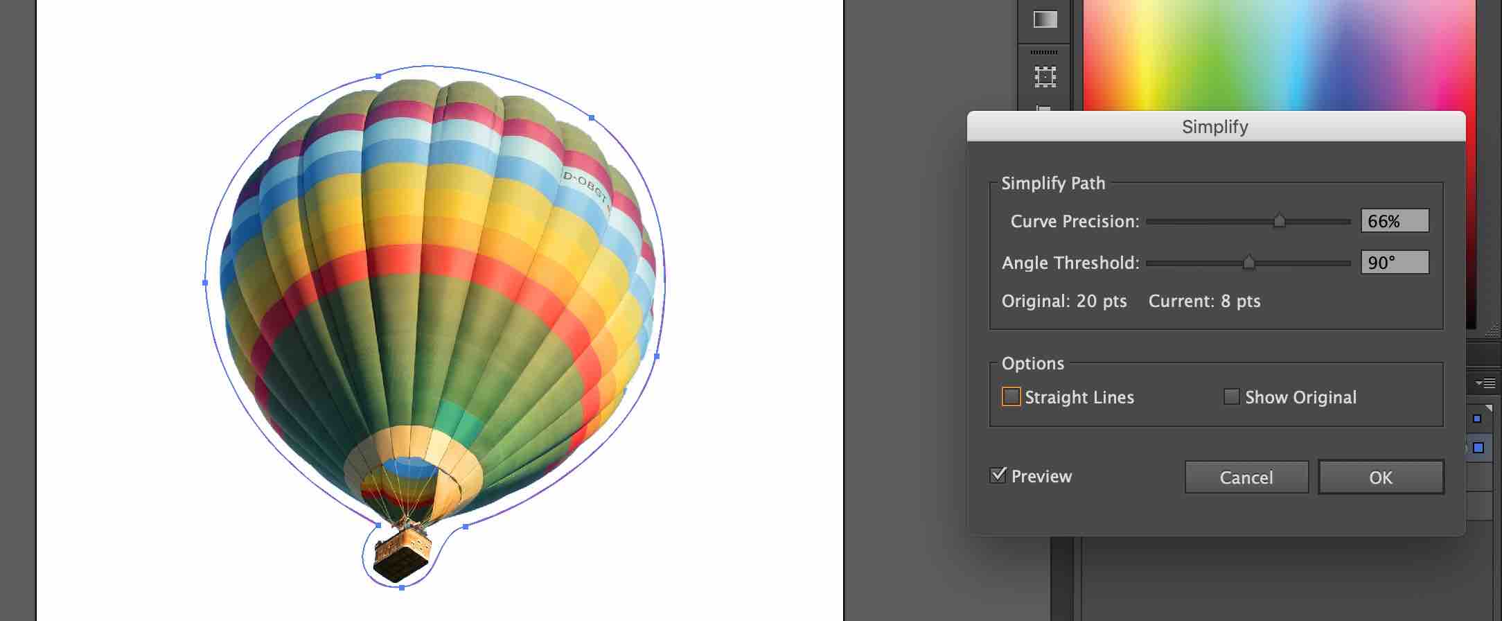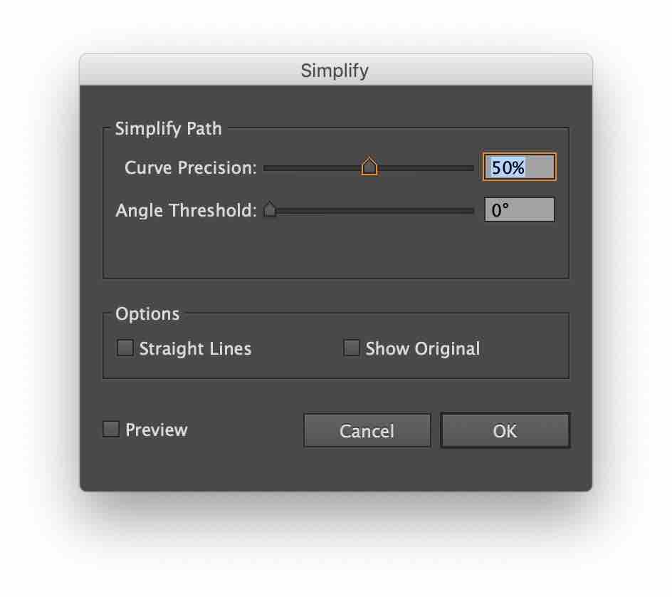 상단 메뉴의 [개체(Object)]-[패스(Path)]-[단순화(Simplify)]를 선택하면 펜툴을 사용하여 그린 칼선의 '고정점(Anchor Point)'의 개수를 줄임으로써 칼선을 단순화할 수 있습니다. 칼선에 고정점 개수가 너무 많으면 인쇄 업체에 스티커 제작을 맡길 때 어려움이 있을 수 있습니다. 따라서 칼선의 형태는 단순한 것이 좋습니다.