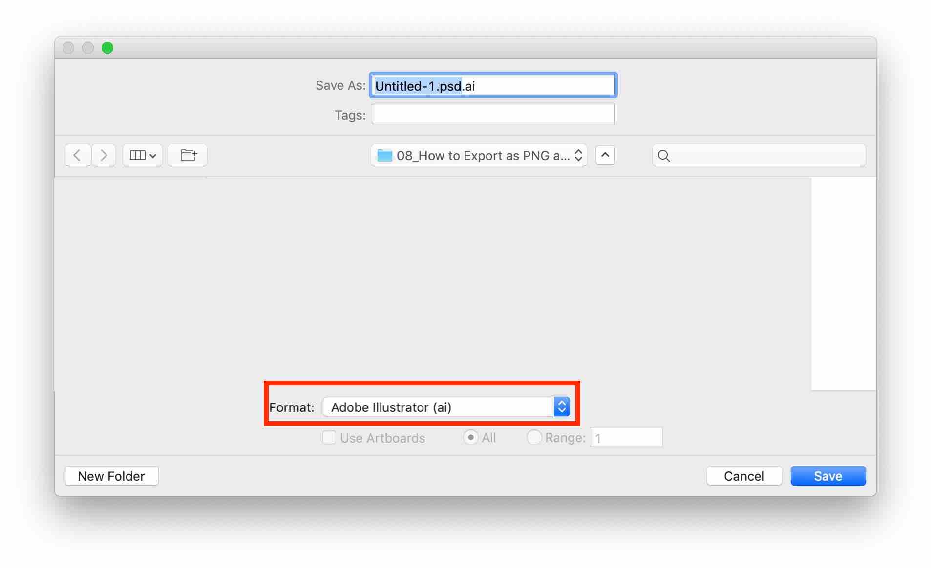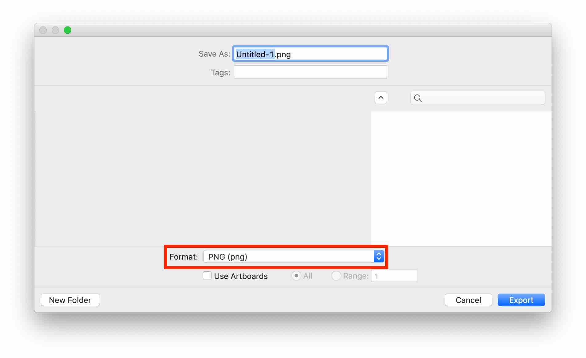 그러나 형식(Format)의 드롭 다운 메뉴를 선택하면 PNG나 JPG와 같은 형식은 보이지 않습니다.
