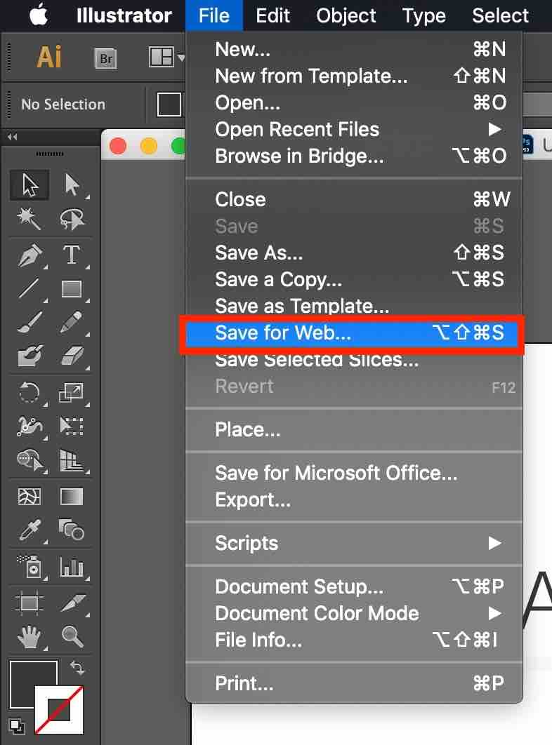 일러스트레이터에서 작업한 파일을 PNG 또는 JPG 형식의 파일로 저장하기 위해서는 상단 메뉴의 [파일(File)]-[웹용으로 저장(Save for Web...)]을 선택해야 합니다.