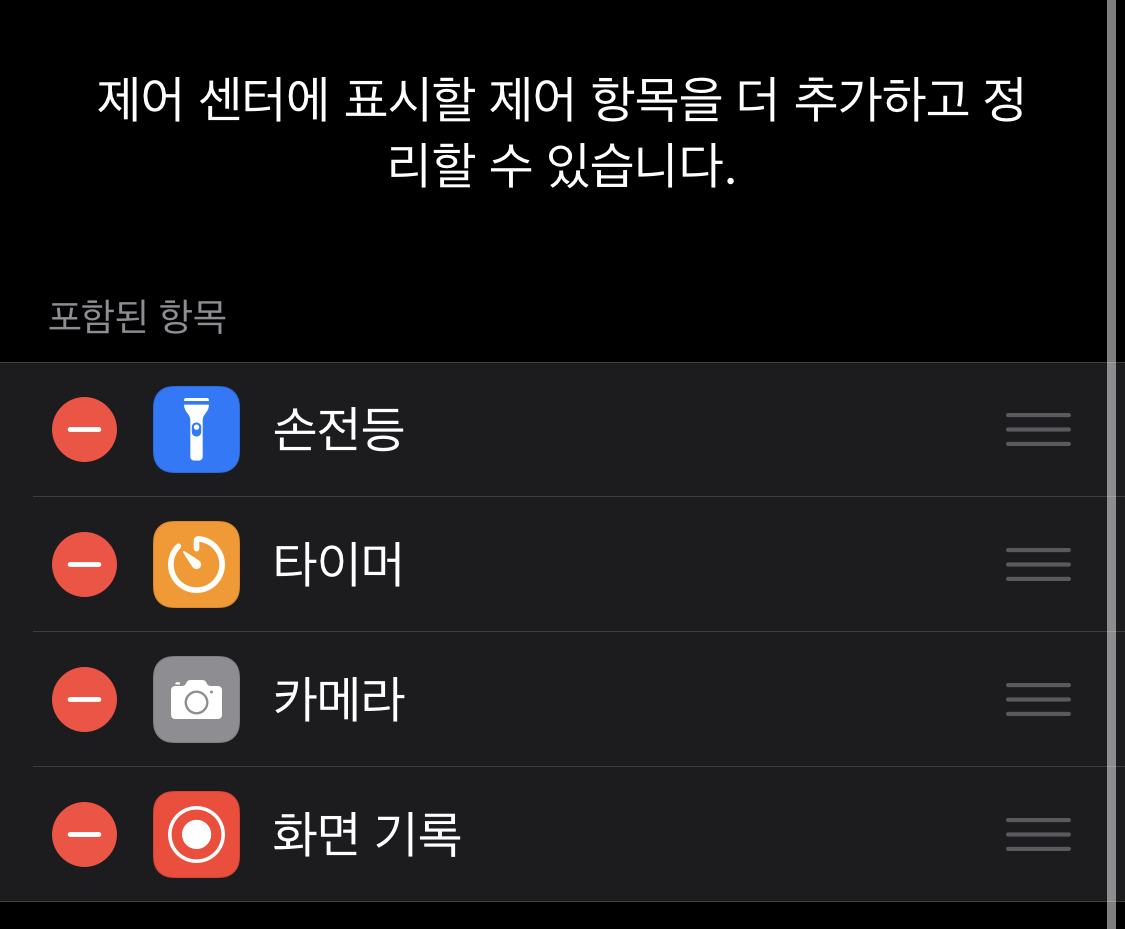 - [설정] - [제어 센터] - [제어 항목 사용자화] 진입